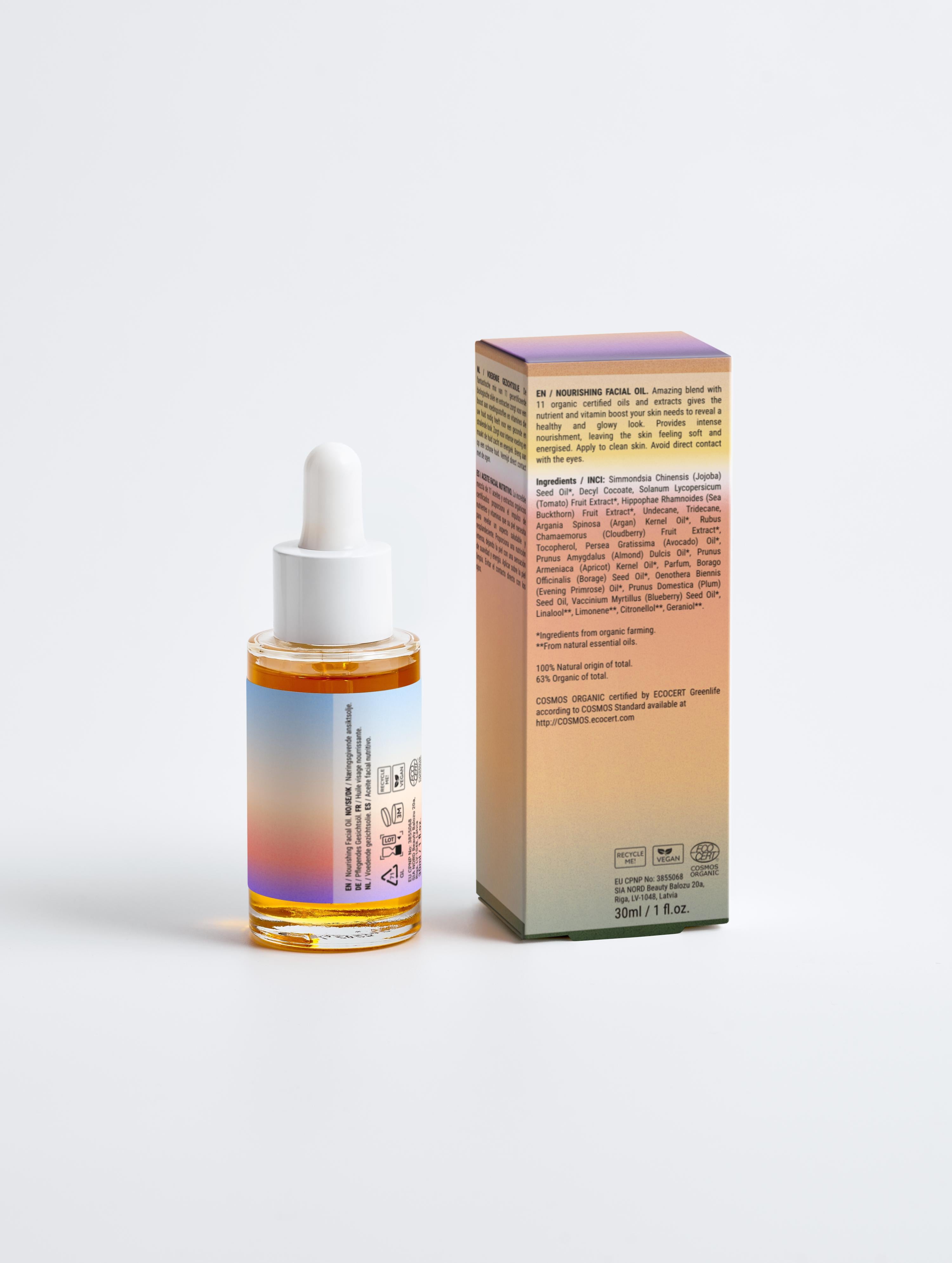 Nourishing Facial Oil: Simmondsia Chinensis (Jojoba) Seed Oil➀, Decyl Cocoate, Solanum Lycopersicum (Tomato) Fruit Extract➀, Hippophae Rhamnoides (Sea Buckthorn) Fruit Extract➀, Undecane, Tridecane, Argania Spinosa (Argan) Kernel Oil➀, Rubus Chamaemorus (Cloudberry) Fruit Extract➀, Tocopherol, Persea Gratissima (Avocado) Oil➀, Prunus Amygdalus (Almond) Dulcis Oil➀, Prunus Armeniaca (Apricot) Kernel Oil➀, Parfum, Borago Officinalis (Borage) Seed Oil➀, Oenothera Biennis (Evening Primrose) Oil➀, Prunus Domestica (Plum) Seed Oil, Vaccinium Myrtillus (Blueberry) Seed Oil➀, Linalool➁, Limonene➁, Citronellol➁, Geraniol➁